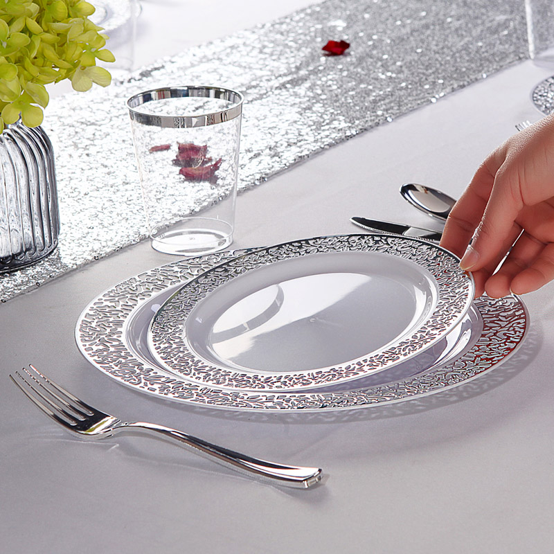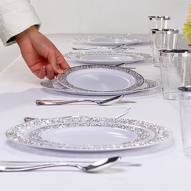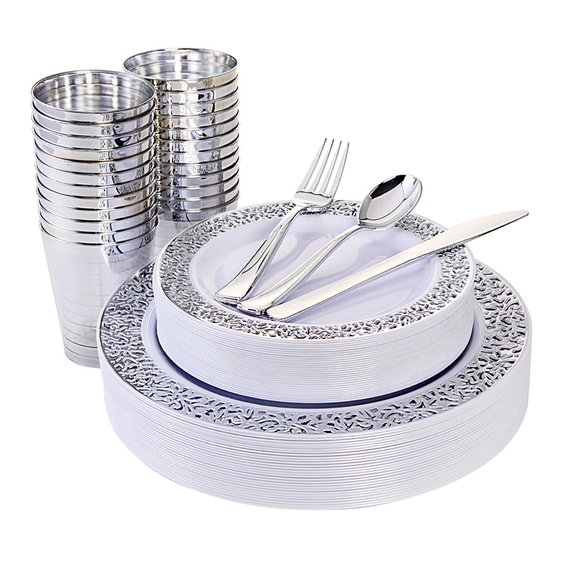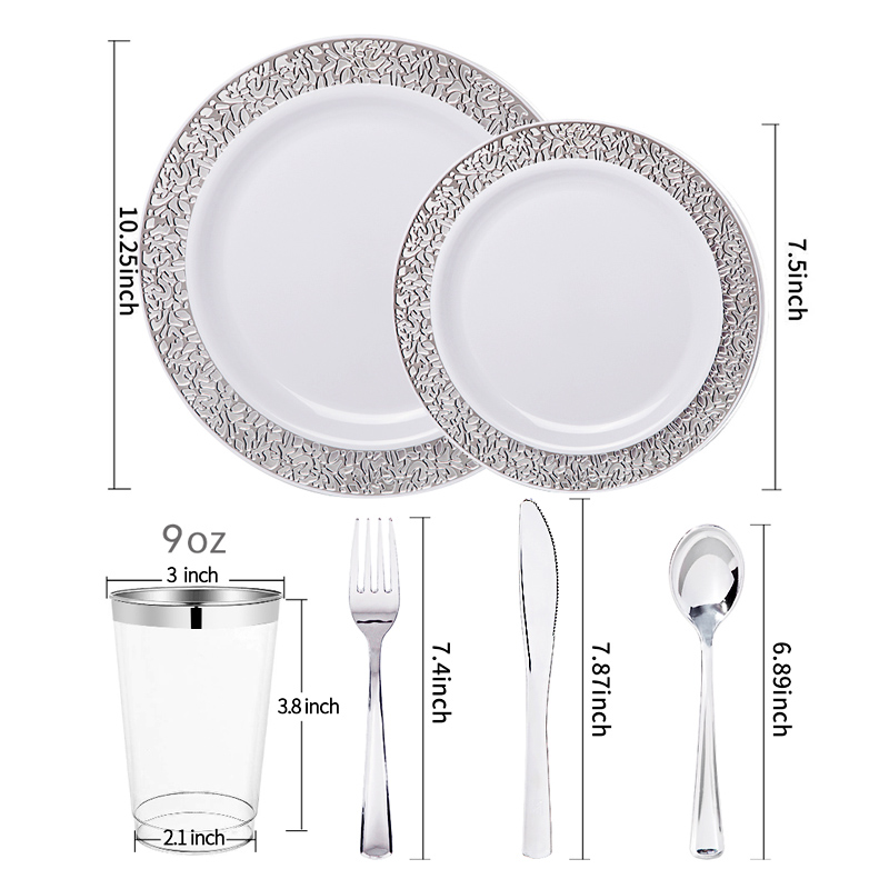 Silver plastic cutlery &plates combo is an absolutely classic and most popular tableware that will add so much to your elegance evening and make your table stunning. Because the classic color and design make the goods elegant, pretty beautiful which can suit for any holiday parties, weddings,Easter, birthday and so on any occasions. Almost everything came in tact!