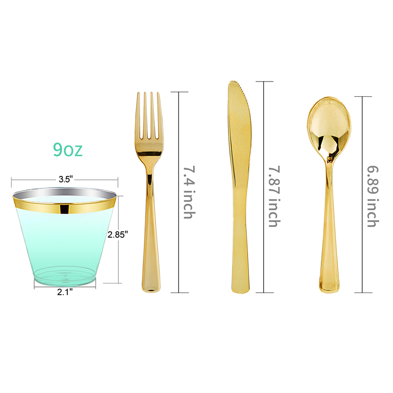 Dinner plates Size: 9.5inch Dessert plates size: 7.5inch Knife size: 7.87inch Fork size: 7.4inch Spoon size: 6.89inch Cup size: 9oz