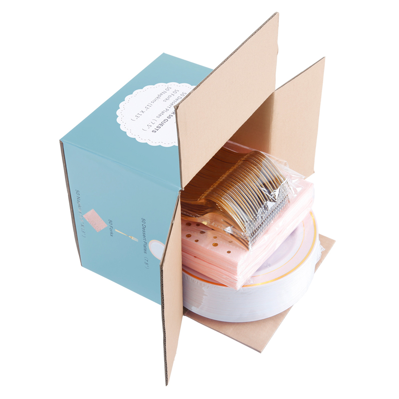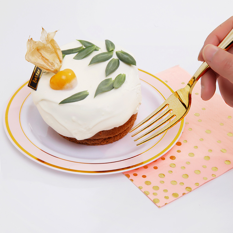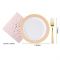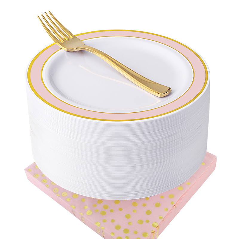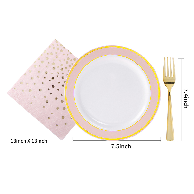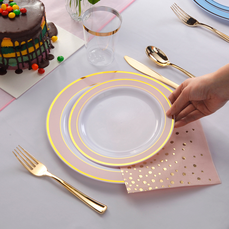Gold plastic cutlery & pink and gold rim plates & gold rim cups combo is an absolutely classic and most popular tableware that will add so much to your elegance evening and make your any holiday parties, weddings, birthday and so on any occasions stunning.