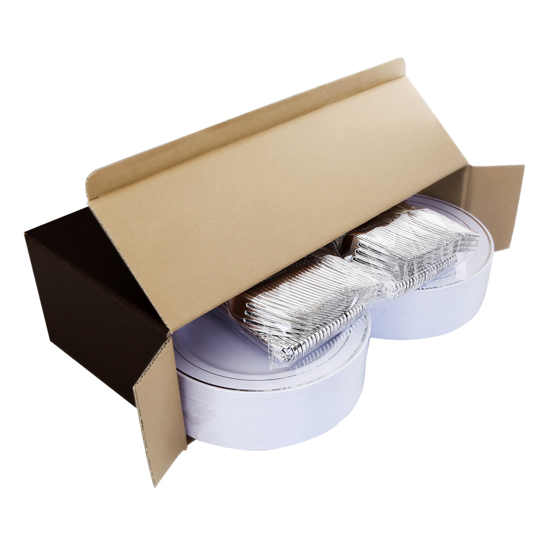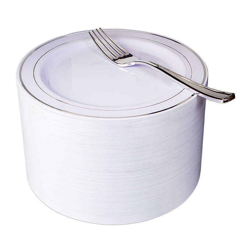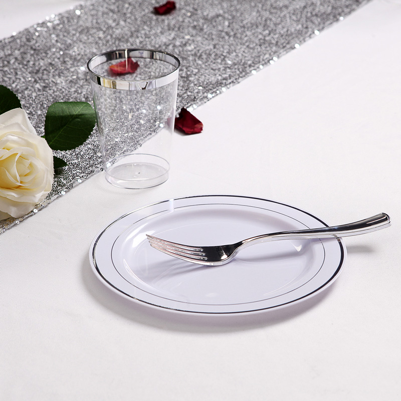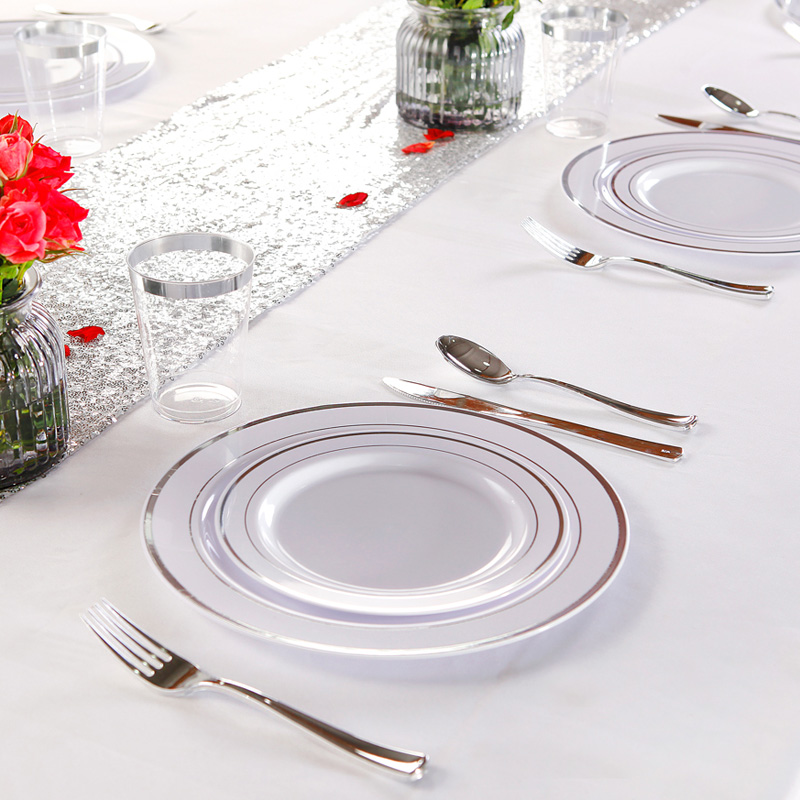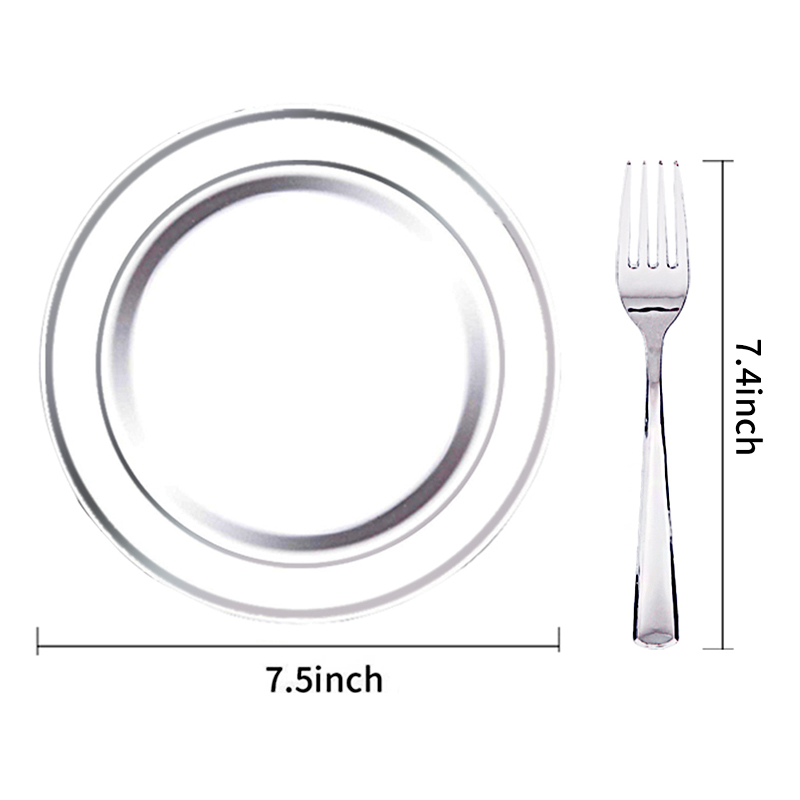 NERVURE- We are focus on quality of life,providing premium products and making life more interesting. Silverware is an absolutely classic and popular product. Classic color and design, make the product elegant, beautiful, can be applied to any holiday parties, weddings, Easter,birthdays and other occasions. Disposable silver rim plastic plates are easy to carry as common kitchen items, and they can be used for picnics and any other outdoor use. The right size and weight can also be used for any food. I hope our products can facilitate your life, let you have a good day!