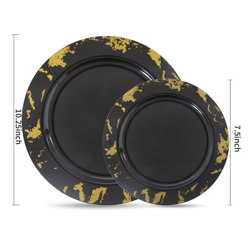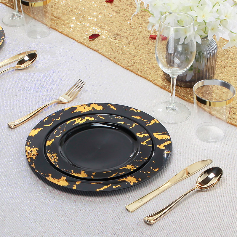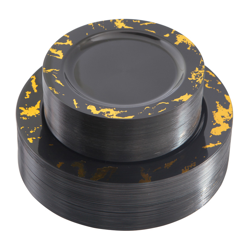 Black with Gold Marbling Plastic Plates including 51Plastic Dinner Plates 10.25inch,51 Salad Plates 7.5inch