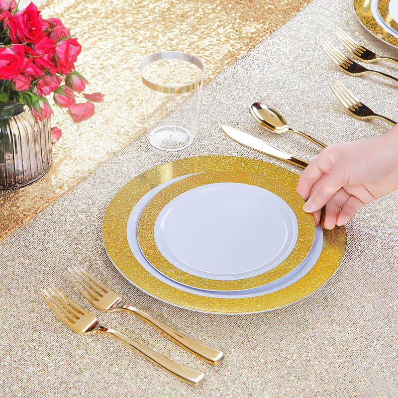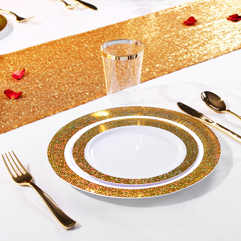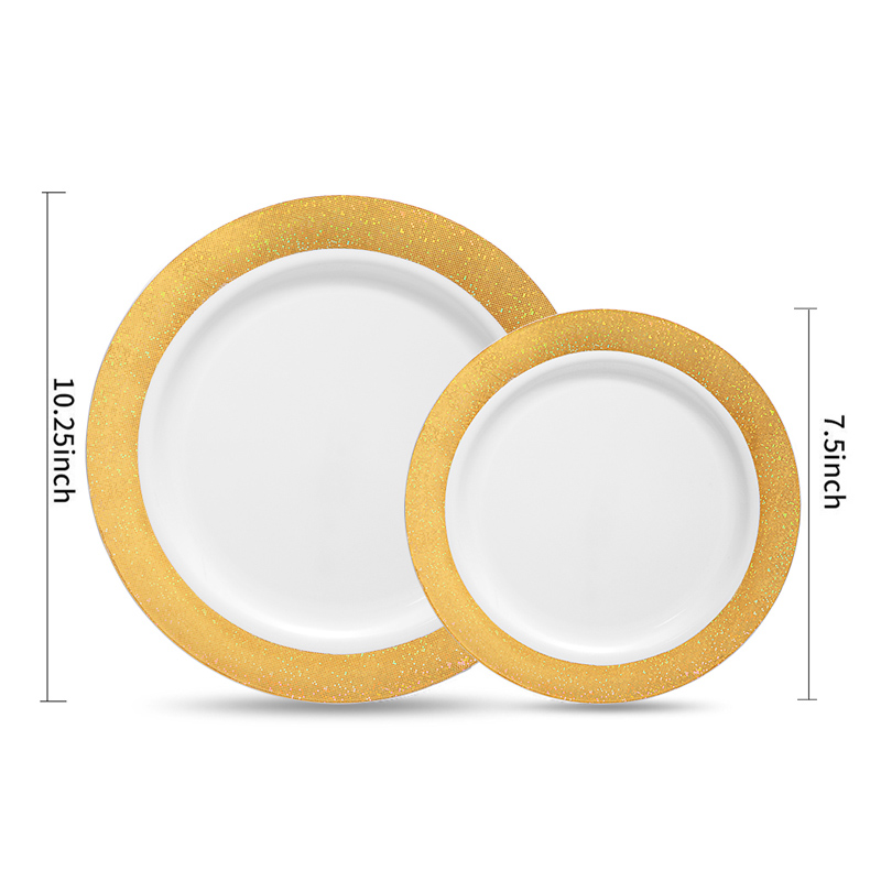 NERVURE- We are focus on quality of life,providing premium products and making life more interesting. The gold colorful rimming plates look like different both day time and night ! That's the best design of disposable plates for impress your every friends . Our premium disposable plates are made from extra heavy duty plastic and will hold up great no matter what you plan on serving, from hot to cold, or wet to dry these charming plates are your go to, must have party dinnerware. And with their appealing looks and special style you'll get nothing but compliments and smiles as you enjoy your hard work. Special gold rimming disposable tableware, your first step to making it easier!