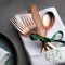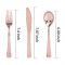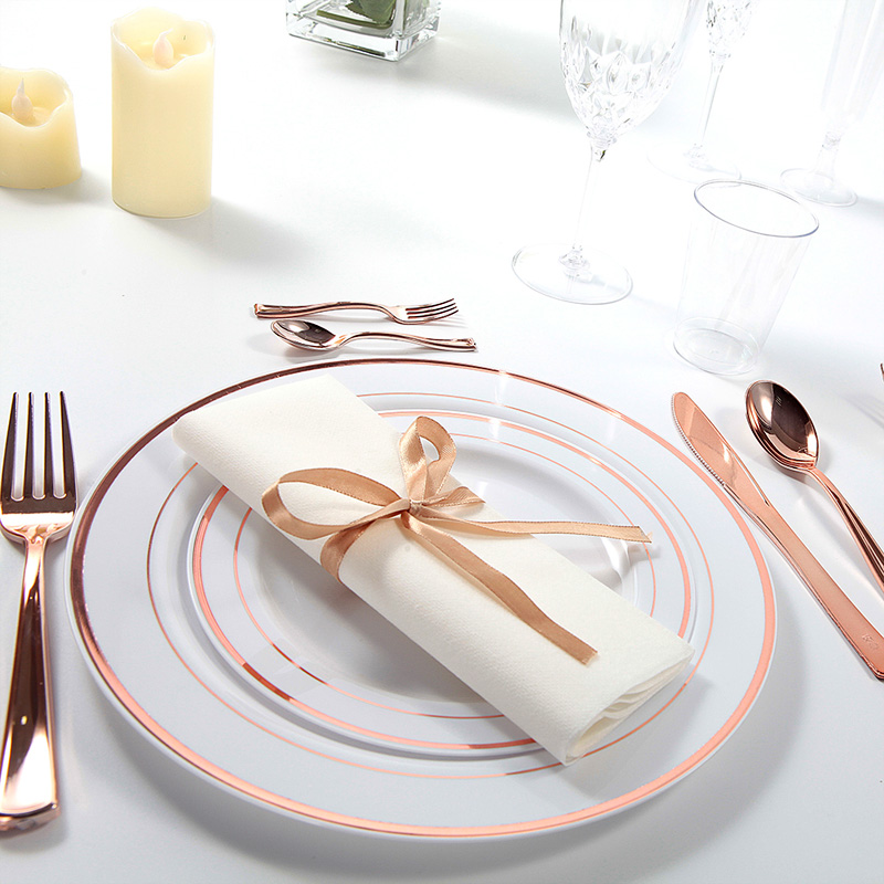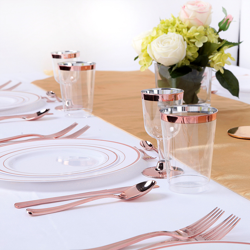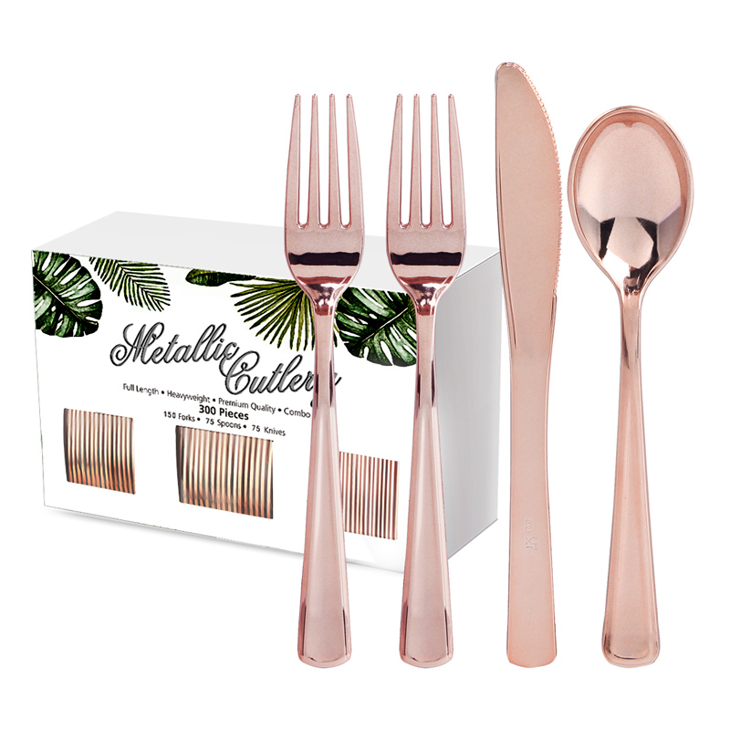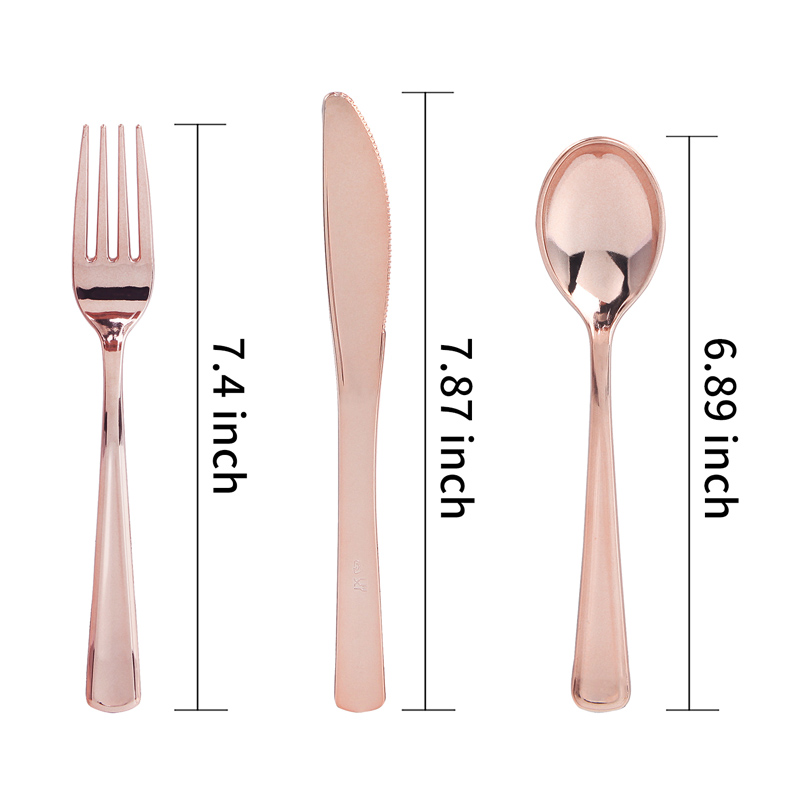 The rose gold cutlery you've been looking for is finally here!This rose gold tableware will make you happy in every way!If you want to impress all your friends at your party, they will be your first choice.The only consequence is that you can throw it away after use without washing it.I believe that if you use golden cutlery, other common cutlery will be overshadowed by you.Its metallic imitation gives you the feeling that it's a real metal cutlery.Our packing is simple and you can keep it in the car for later use.Because it's heavy and durable, you don't have to worry about being damaged.This plastic tableware is typically designed for men, women and children alike.Gold disposable tableware, your first step to making it easier!"