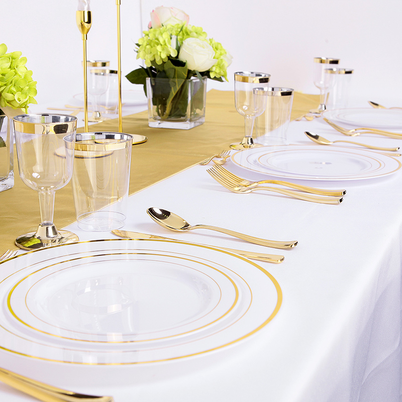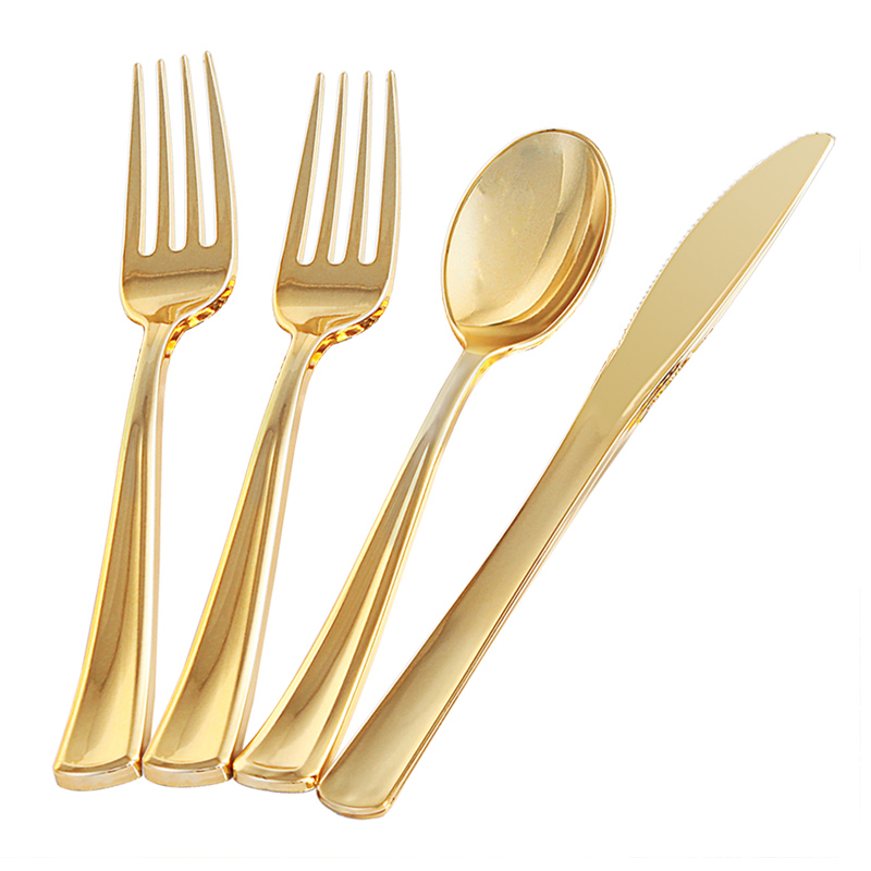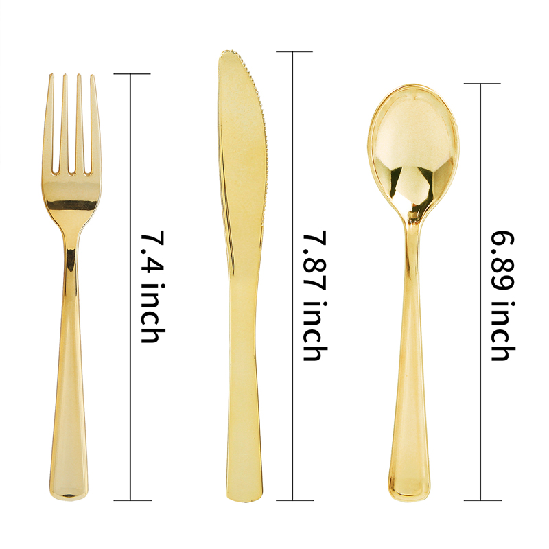 The gold cutlery you've been looking for is finally here!This gold tableware will make you happy in every way!If you want to impress all your friends at your party, they will be your first choice.The only consequence is that you can throw it away after use without washing it.I believe that if you use golden cutlery, other common cutlery will be overshadowed by you.Its metallic imitation gives you the feeling that it's a real metal cutlery.Our packing is simple and you can keep it in the car for later use.Because it's heavy and durable, you don't have to worry about being damaged.This plastic tableware is typically designed for men, women and children alike.Gold disposable tableware, your first step to making it easier!